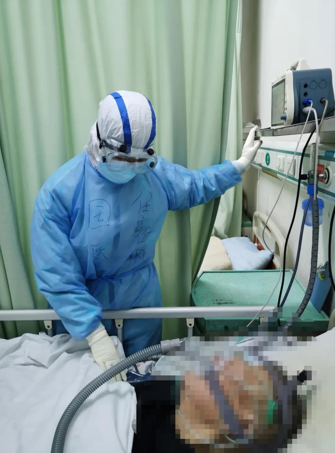 凌晨1點(diǎn)多,一位84歲的老人,確診為陽(yáng)性,無(wú)尿,四肢冰冷,使用呼吸機(jī)。我們迅速補(bǔ)液,并用手套自制的暖水袋給予保暖,同時(shí)不停地喊著:“爺爺,爺爺,不能放棄,加油,我們陪在你的身邊,一起和病毒做斗爭(zhēng)!”他好像能聽(tīng)得見(jiàn)我們說(shuō)話(huà),微微地動(dòng)了一下頭,眼角濕潤(rùn)了。