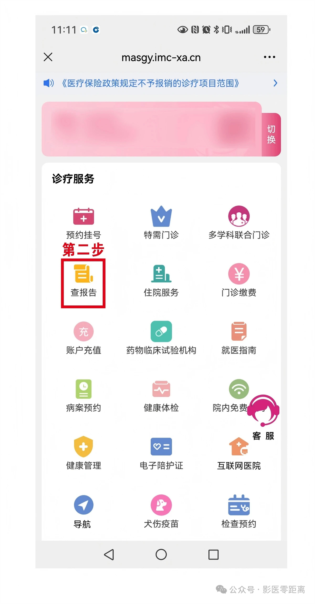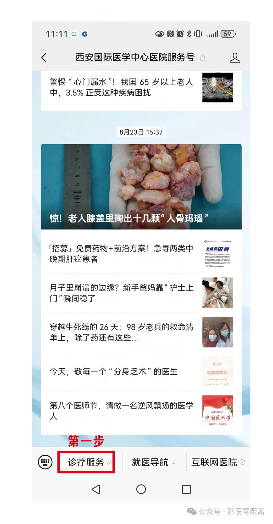 第一步:在醫(yī)院微信公眾號(hào)首頁(yè),點(diǎn)擊底部菜單欄左側(cè)的【診療服務(wù)】入口